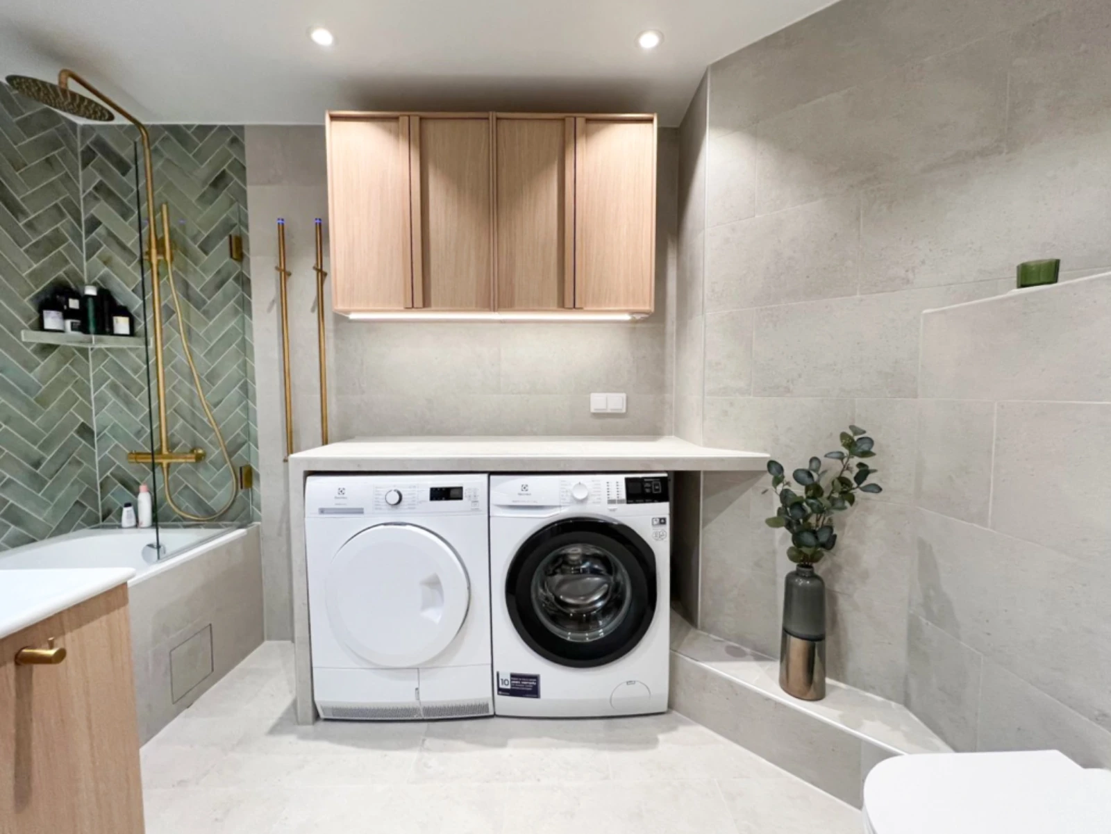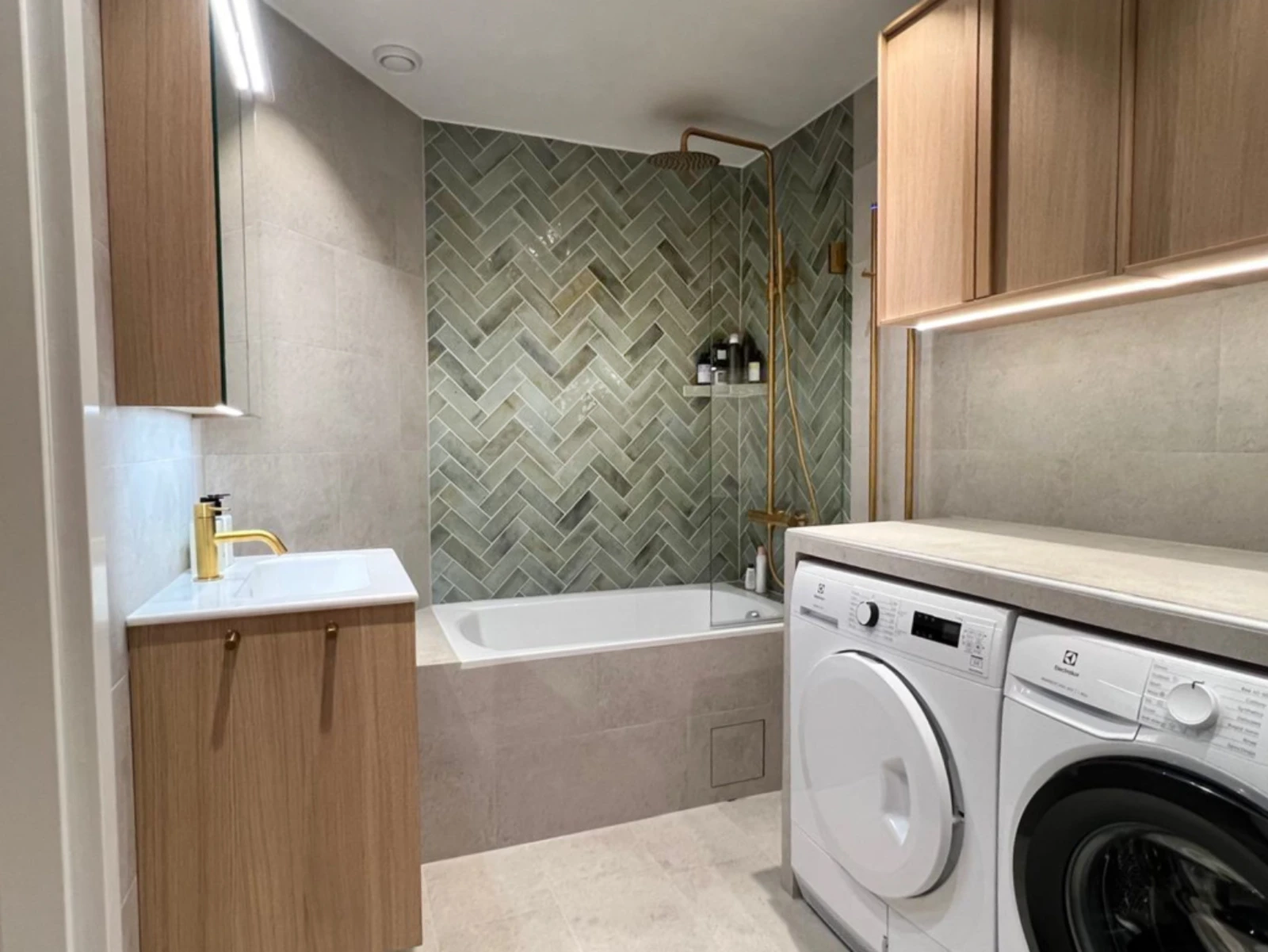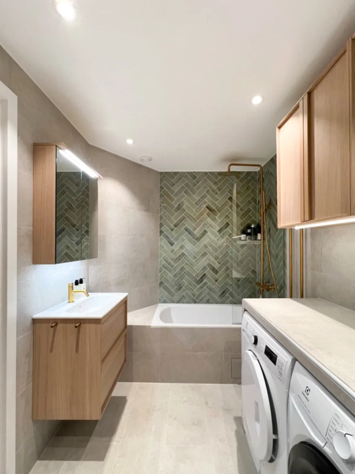 Detta badrum på Östermalm kombinerar ljusa stenytor med grönt kakel i fiskbensmönster som fond i duschen. Mässingsdetaljer och platsbyggda hyllor skapar både funktion och en exklusiv känsla. Träinslag i kommod och förvaring adderar värme och balans till helheten.