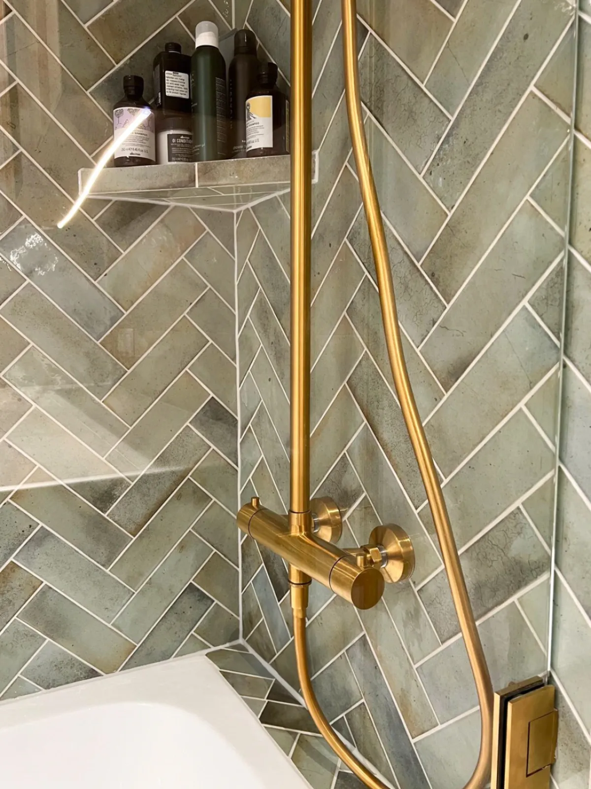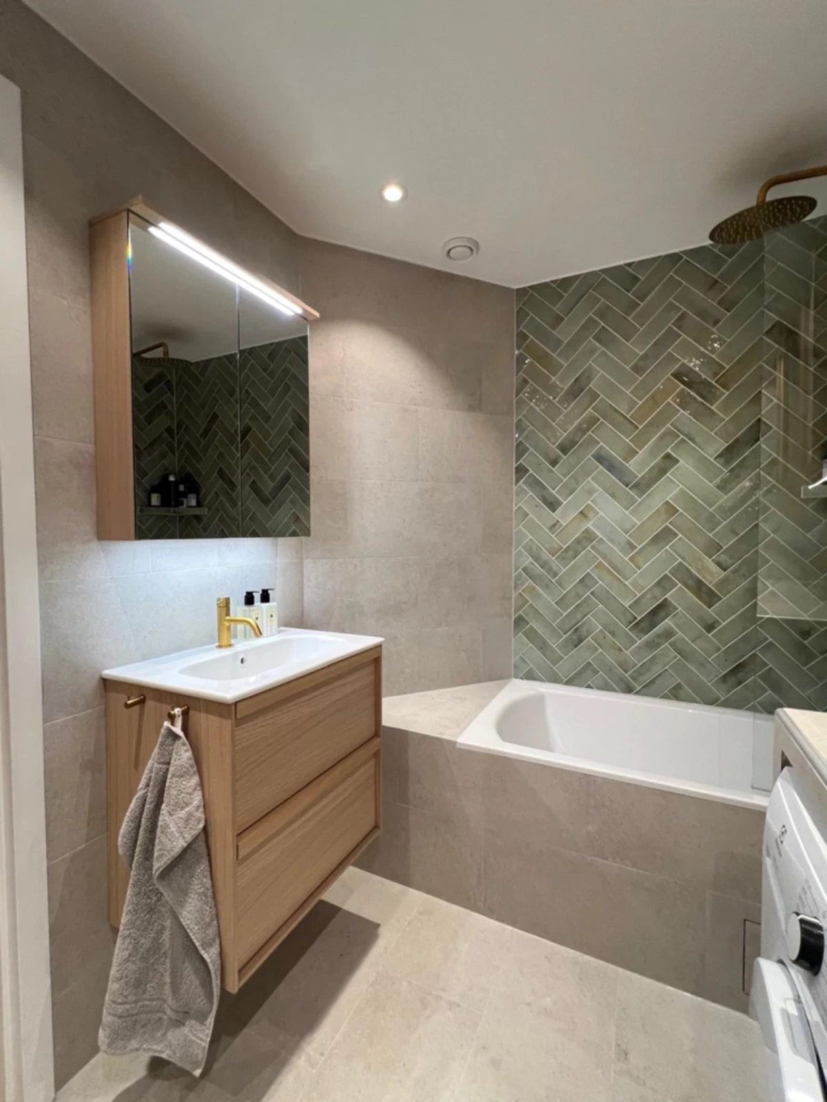 Det här badrummet på Östermalm är en elegant kombination av form och funktion, där grön kakel i marmorliknande finish sätts i fiskbensmönster och möter ljusa ytor i naturton. Den varma mässingen i blandare och dusch skapar ett exklusivt uttryck som genomsyrar hela rummet.