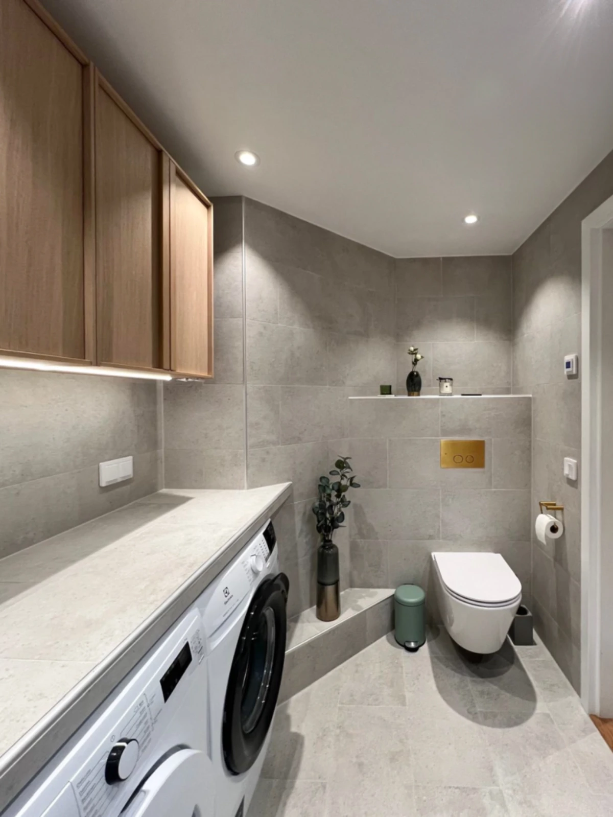 Med både badkar, dusch och tvättlösning har badrummet en genomtänkt planering som förenar estetik med praktisk funktion. Träfanér i kommod och väggskåp adderar ett naturligt lugn och förstärker den varma färgpaletten. Ett badrum som verkligen kombinerar känsla med kvalitet.