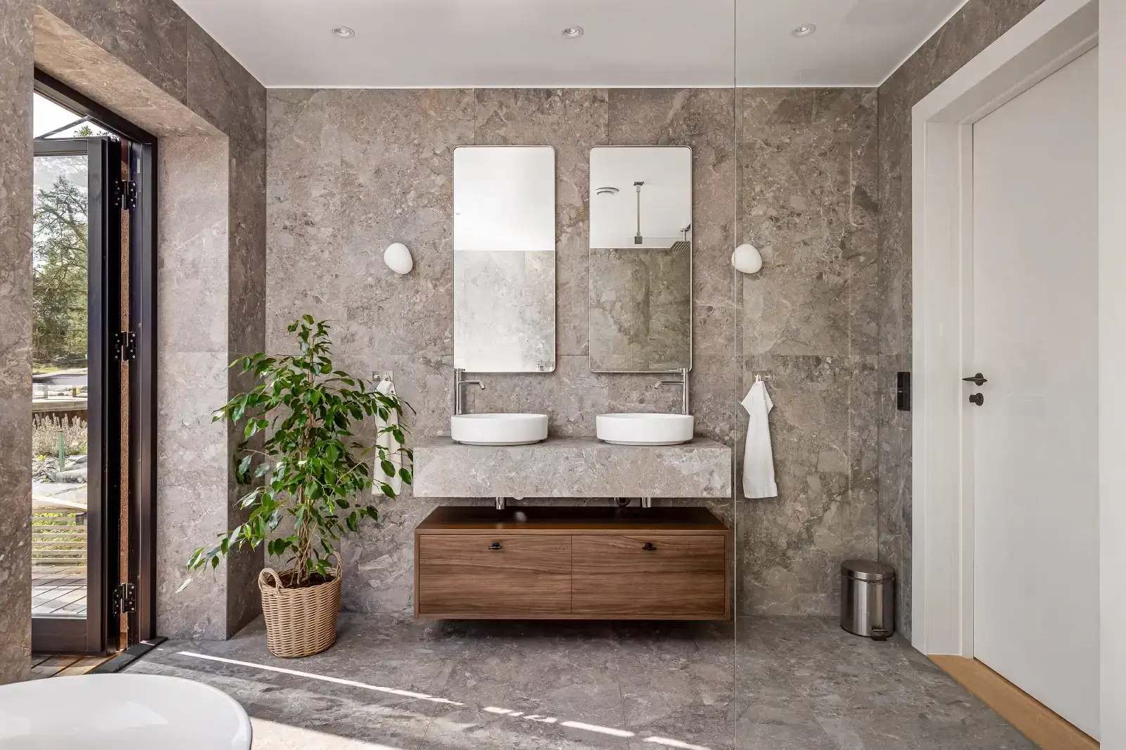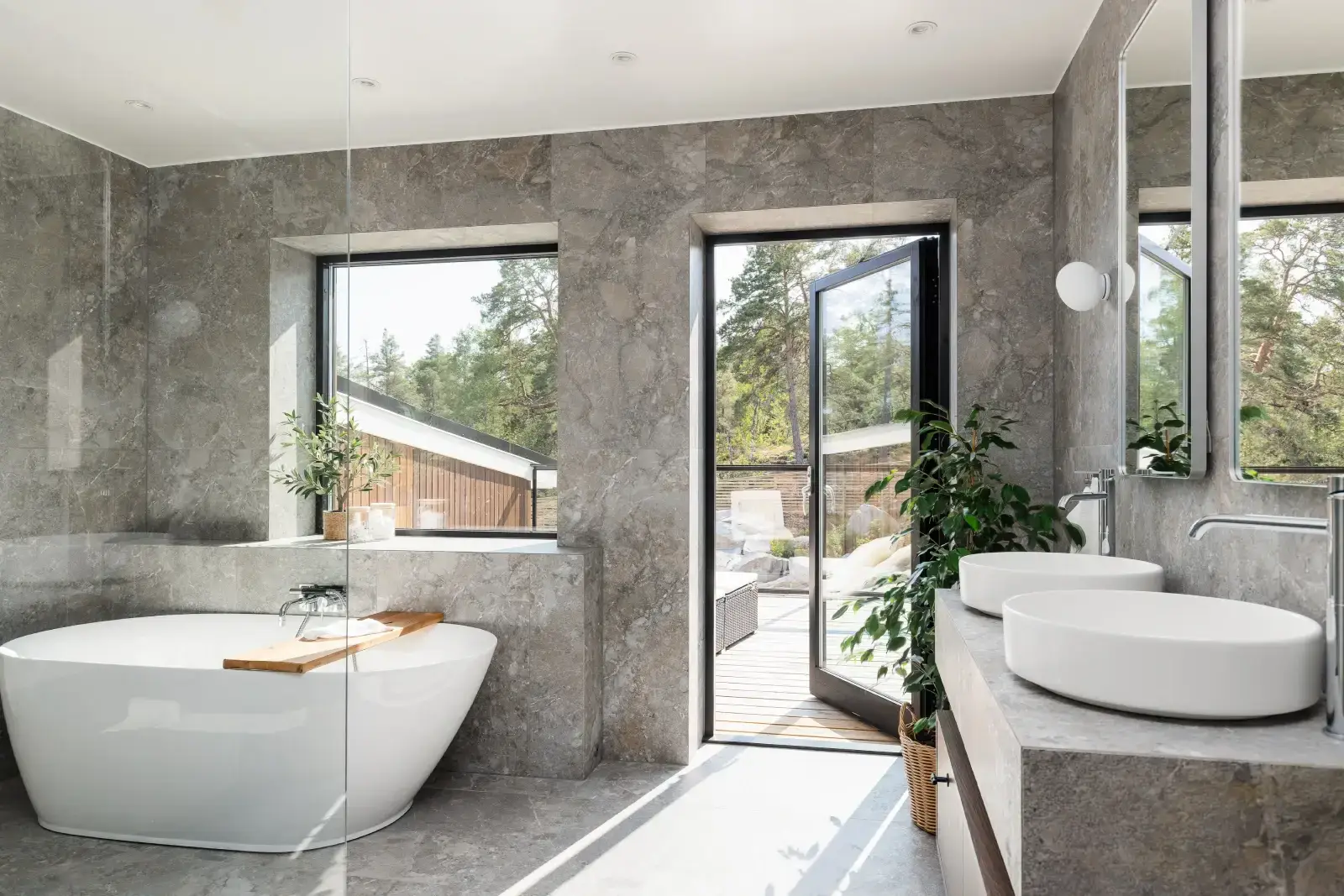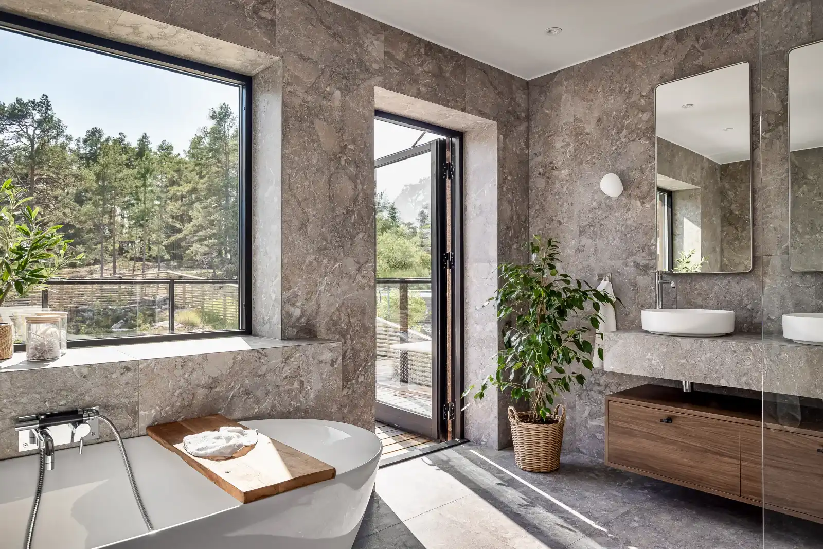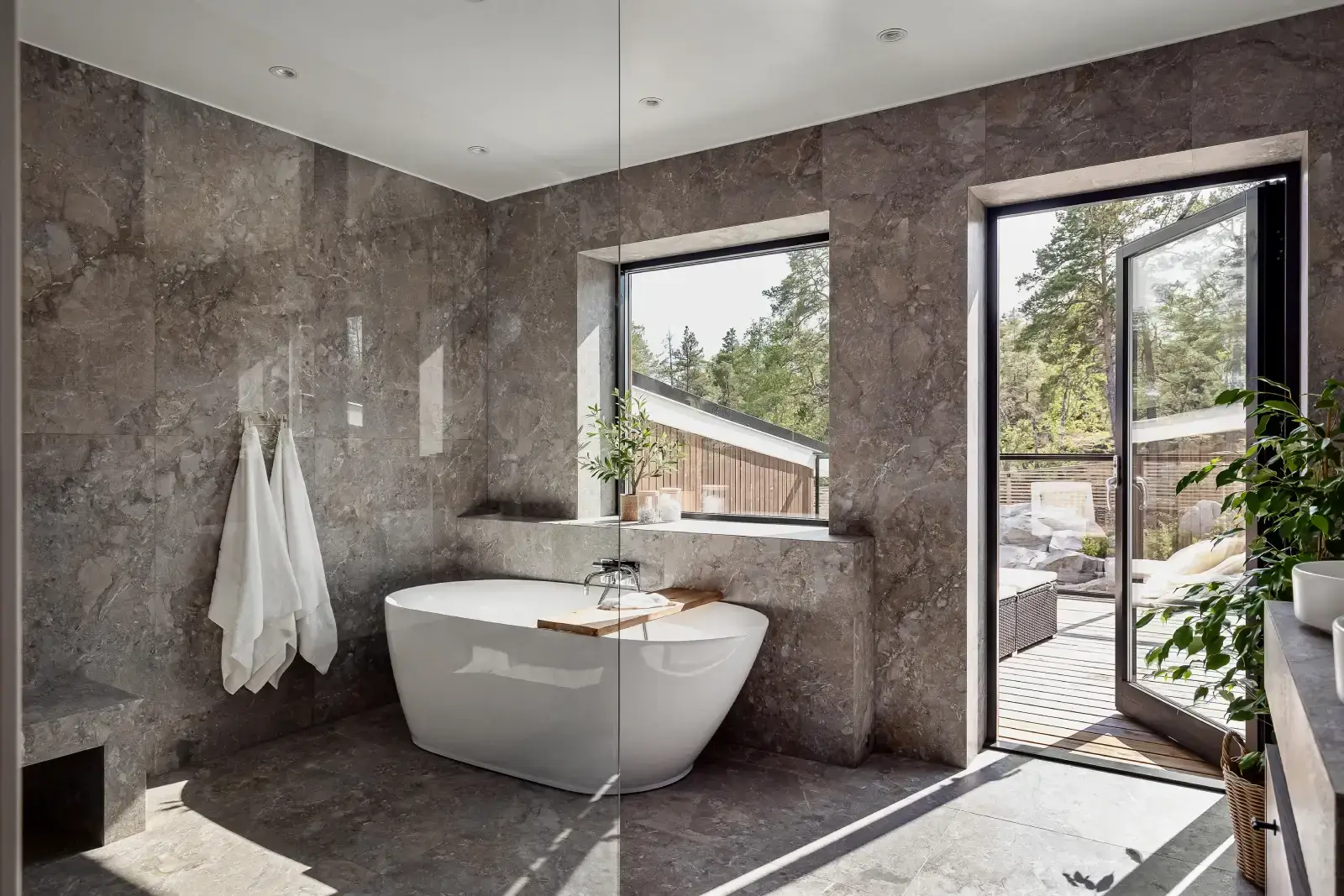 Det här badrummet på Ekerö är ett tydligt exempel på när arkitektur och inredning samverkar. Genomgående naturstensinspirerade ytor skapar ett lugn och binder samman rummet på ett harmoniskt sätt. Det fristående badkaret är placerat med utsikt mot terrassen och omgivande natur, vilket förhöjer känslan av vila och rymd.