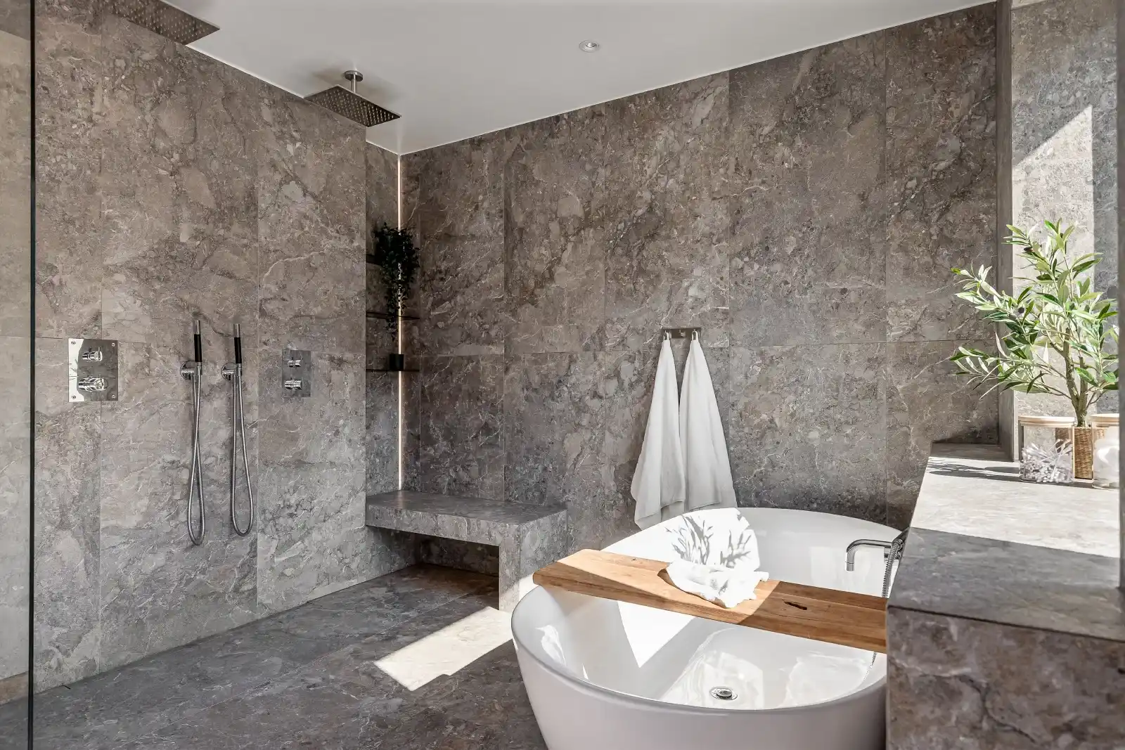 Dubbel kommod med stenskiva, stora duschytor och integrerad sittbänk bidrar till både funktion och lyx. Badrummet har en varm och exklusiv karaktär där detaljerna är noggrant valda för att förstärka det naturliga ljusinsläppet och känslan av spa.